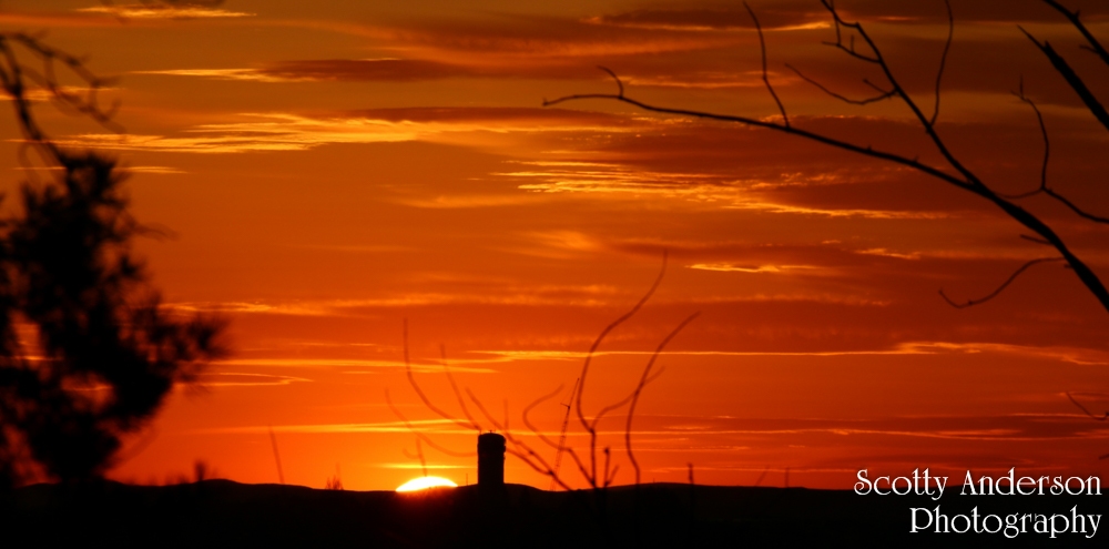 Just a small sliver of the sun is visible from the horizon. The sky is almost totally orange with some areas of yellow bouncing off the high clouds over the Palouse.
