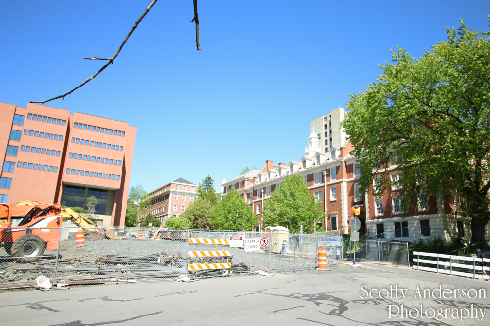 On Washington Street near Nevada Street looking north. The construction site is that of the digital classroom building. The other visible buildings (from left to right) Owen Science Library, Stimson Hall, Waller Hall, and Webster Physical Science.