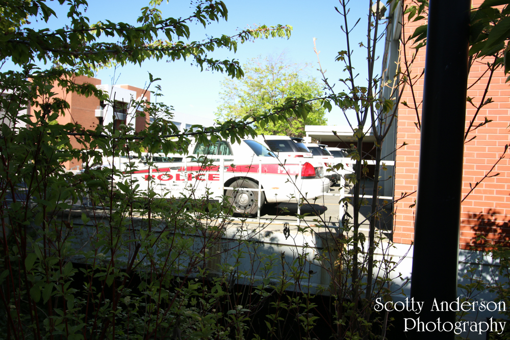 Peaking at the apron of the bays of the Public Safety Building. Police cars are parked on the apron that once housed fire engines and ambulances.